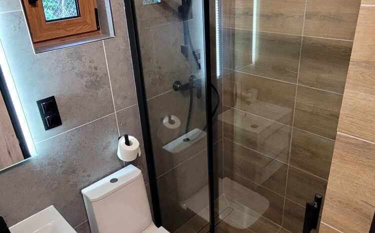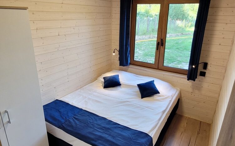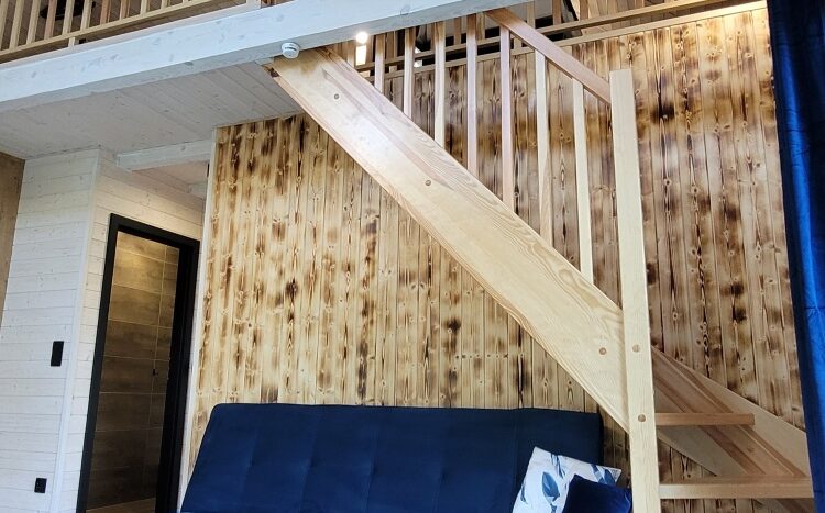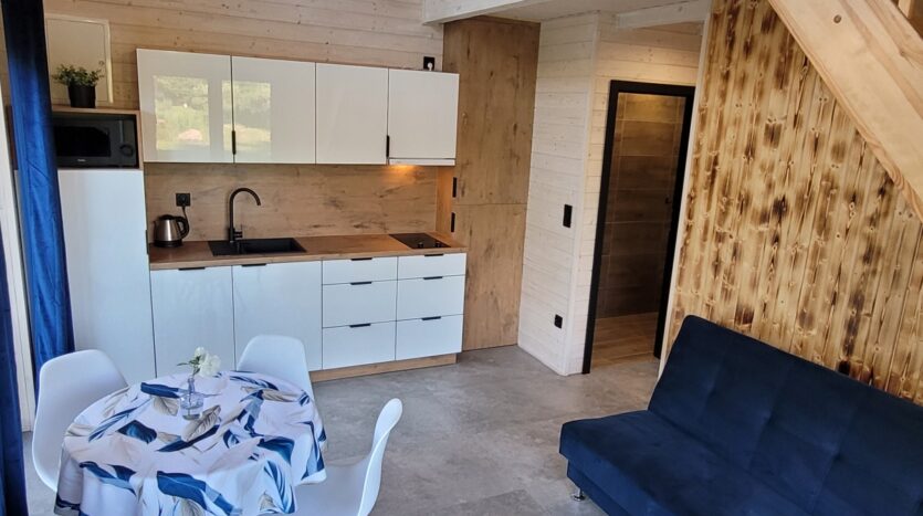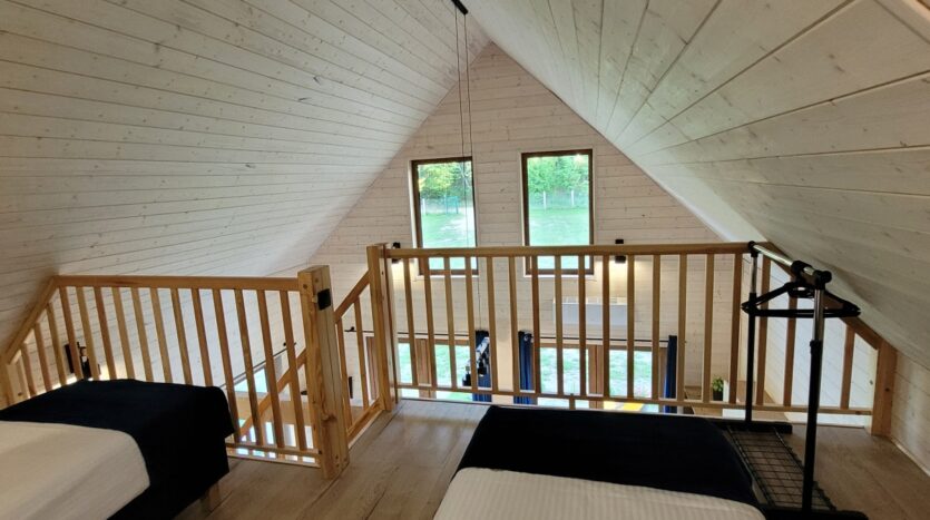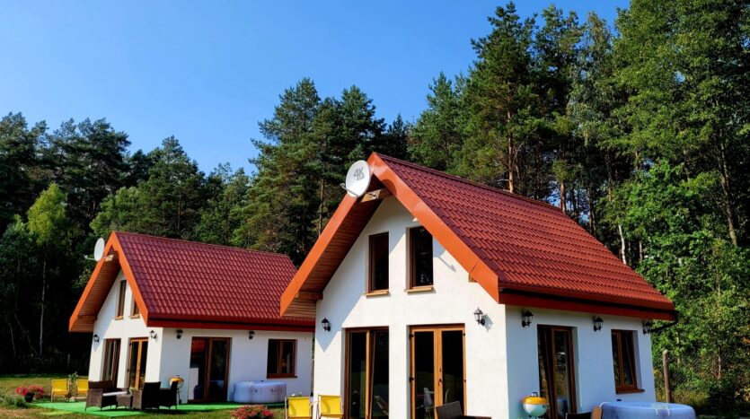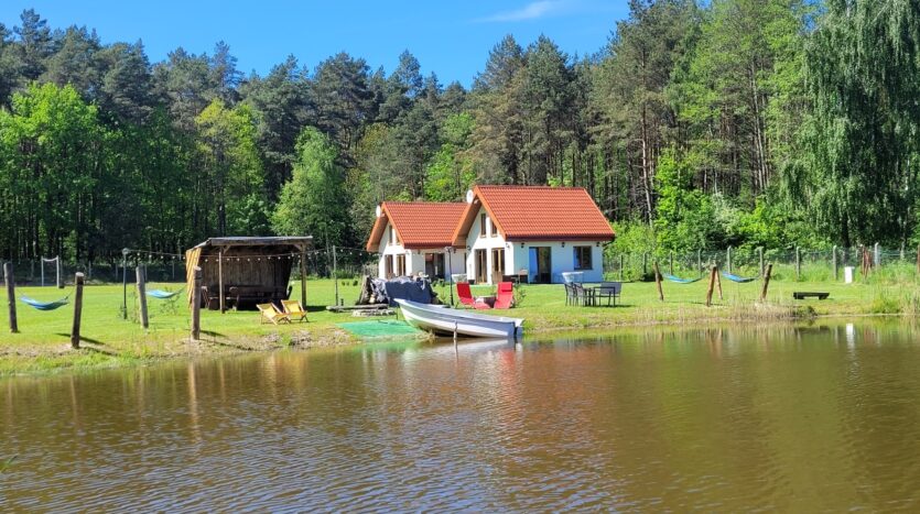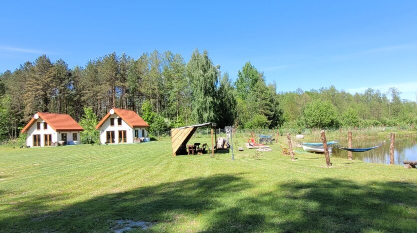 Po jednej stronie stawu znajduje się opisany wyżej dom mieszkalny wraz z garażami, a po drugiej stronie stoją dwa domki caloroczne o powierzchni zabudowy 35m² każdy, obydwa wybudowane w 2023. Powierzchnia po podłodze każdego domku wynosi ok 40m². Są to dwa identyczne domki, murowane i ocieplone z antresolą, wykończone w wysokim standardzie. Kazdy z domków: salon z aneksem kuchennym, łazienka, sypialnia + druga sypialnia na antresoli.