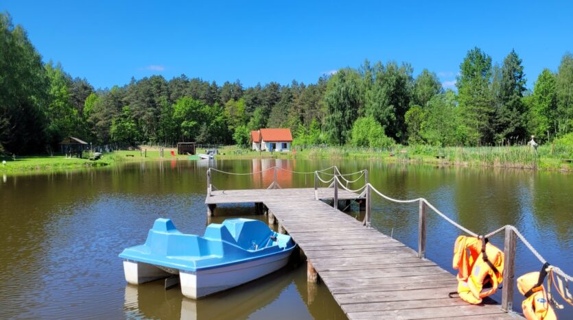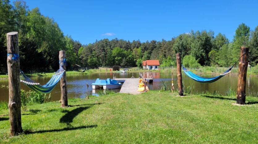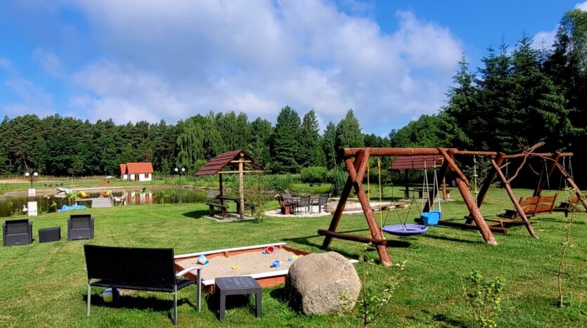 Na działce znajduje się mały plac zabaw, parę hamaków, są 2 miejsca na ognisko, a na stawie znajduje się pomost, z którego można łowić ryby i to bez żadnych ograniczeń i pozwoleń:). Dodatkowo na działce namiot 6m x 12m z ping-pongiem, minibilardem i pilkarzykami. We wrześniu 2025 zakupiona balia na drewno z hydromasażem. Działka jest ogrodzona, a wzdłuż płotu rosną częściowo duże świerki oraz kilka mniejszych świerków, tuj i innych drzewek również owocowych i krzaków zasadzonych w ostatnich latach.