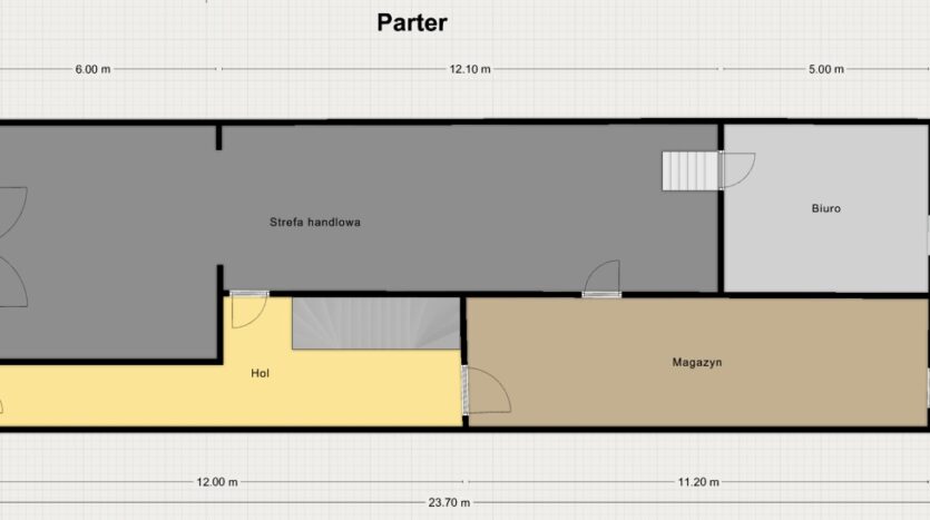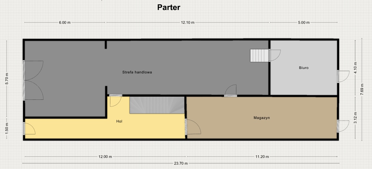 Parter (Poziom 0) – 166 m² (Wynajęte) Reprezentacyjna część komercyjna z dużą witryną od strony Rynku. Układ obejmuje przestronną strefę handlową, hol, biuro na tyłach oraz półpiętro.