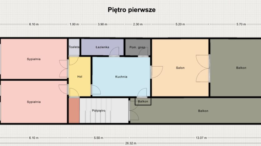 Pierwsze Piętro (Poziom 1) – 186 m² Kondygnacja z ogromnym potencjałem, wymagająca modernizacji. Doskonała pod podział na mniejsze jednostki mieszkalne. Posiada trzy balkony, salon z tarasem, dwie sypialnie i widną kuchnię.