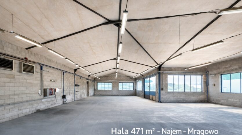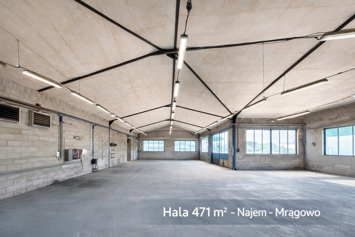Do wynajęcia hala produkcyjno-magazynowa o powierzchni 471 m² zlokalizowana przy ul. Giżyckiej 9 w Mrągowo.