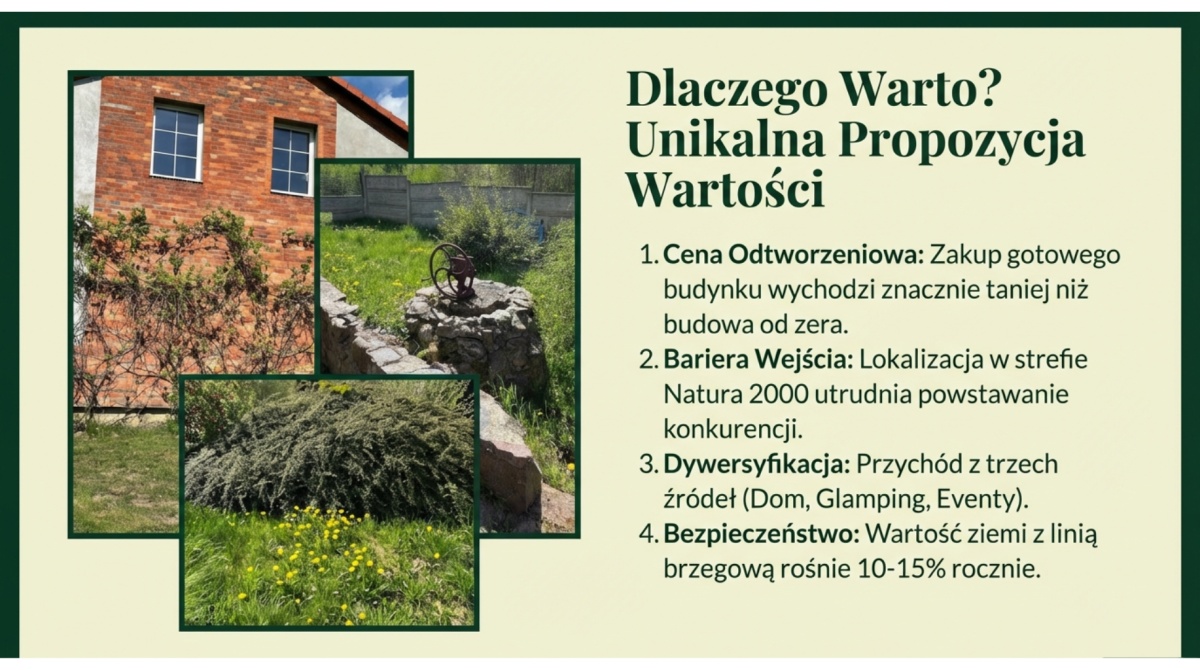 To hybrydowa maszyna inwestycyjna zlokalizowana w strefie Natura 2000, gdzie nowa zabudowa jest niemal niemożliwa. Kupujesz "prawa nabyte" i unikalność, której nie da się doprodukować.