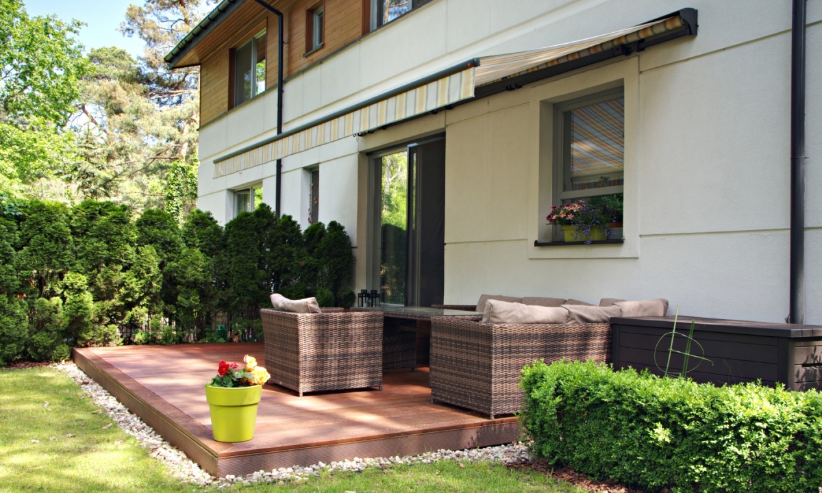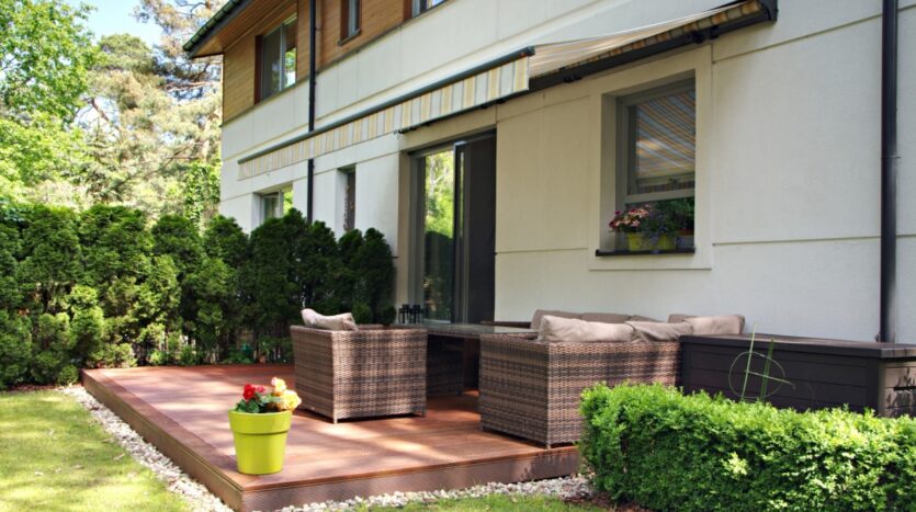 Taras z drewna egzotycznego z wypoczynkiem z techno rattanu