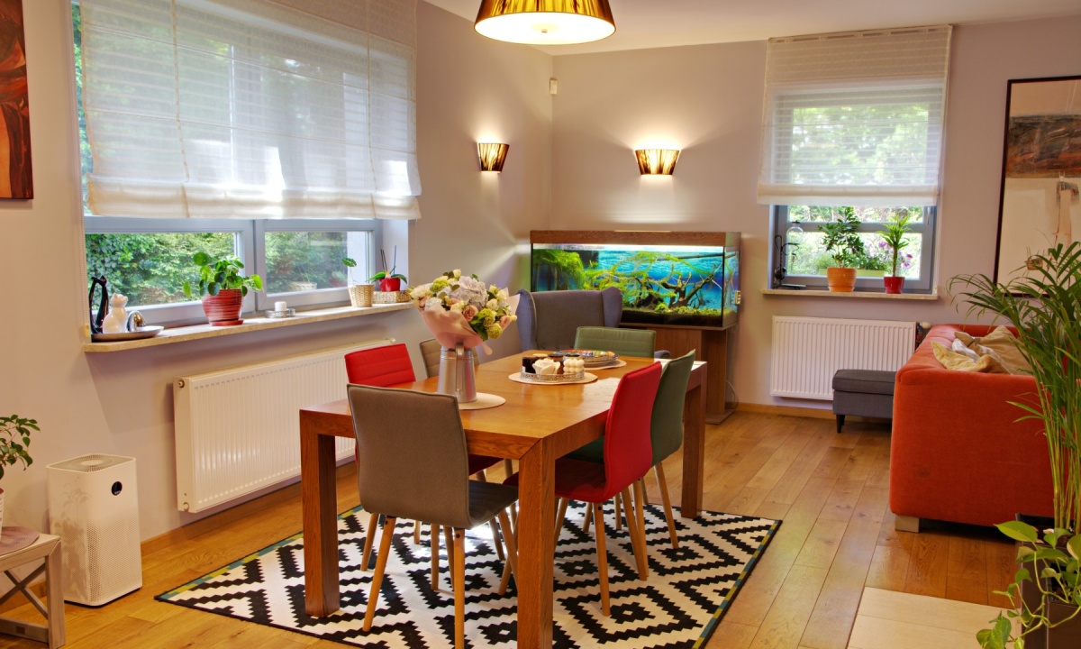 Living room with dining area – the heart of the home, filled with natural light thanks to large windows, ideal for spending time together.