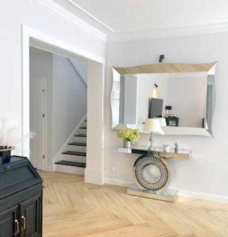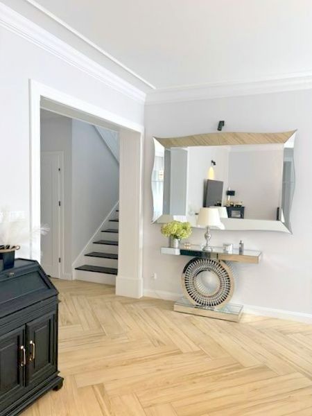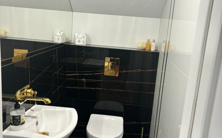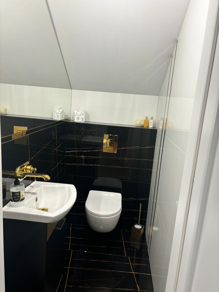 Toaleta z połyskującymi złotymi akcentami które pozytywnie zaskakują. Gresy w bieli z kontrastującą czernią i lustrami optycznie powiększają niewielką przestrzeń.