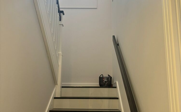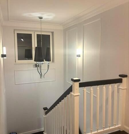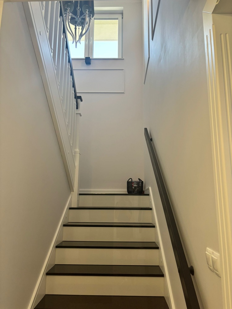 Piękne granitowe schody- Galaxy Star-czarny kamień ze złotymi drobnymi mieniącymi się ziarnami, połączone z białą drewnianą balustradą i lampą daje efekt harmonijnej luksusowej klatki schodowej.