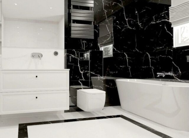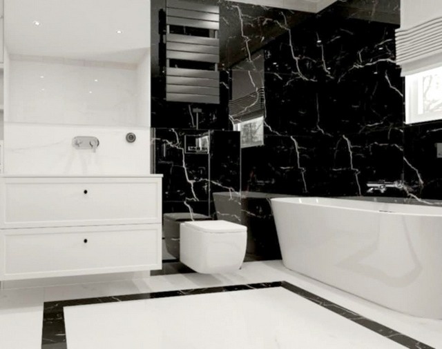 Łazienka w tonacji czarno białej z gresami imitującymi marmur, – z wanną oraz natryskiem. Stylizowane baterie.