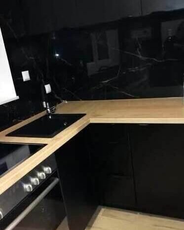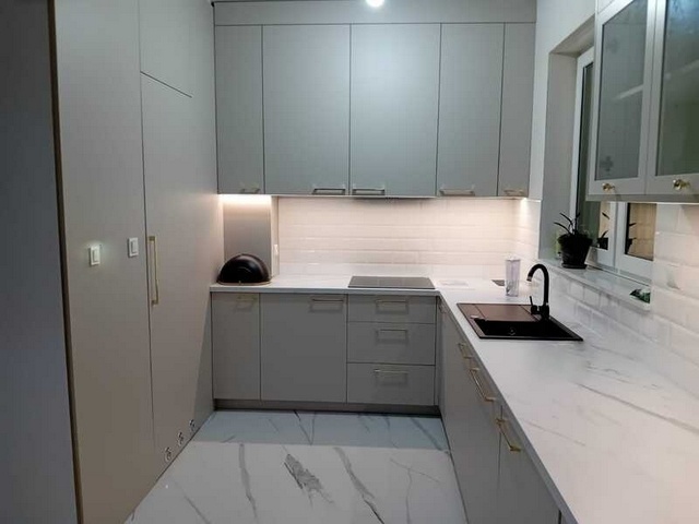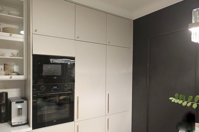 Stonowana, tradycyjna kuchnia nadaje szyku i elegancji. Przeszklenia w witrynach nadają lekkości i wspaniale eksponują szkło bądź porcelanę.
