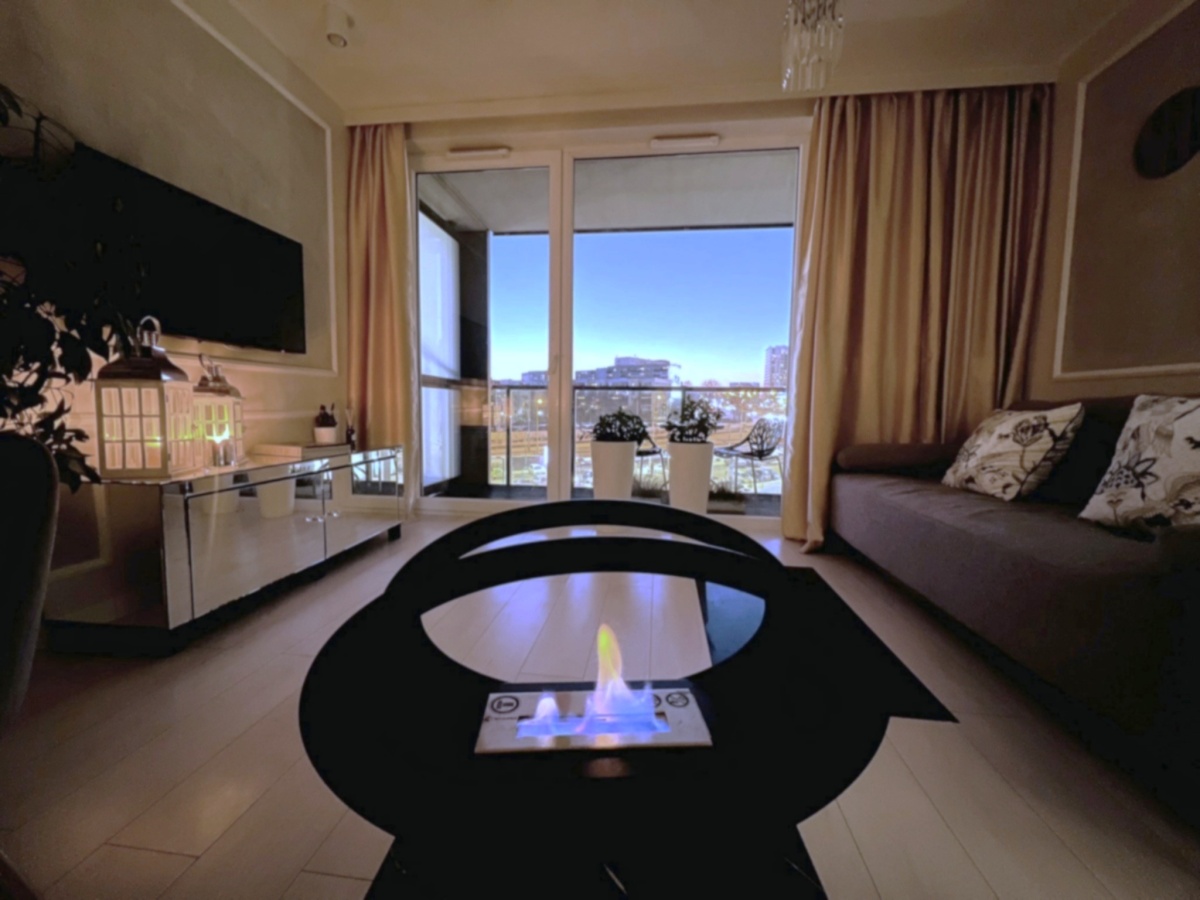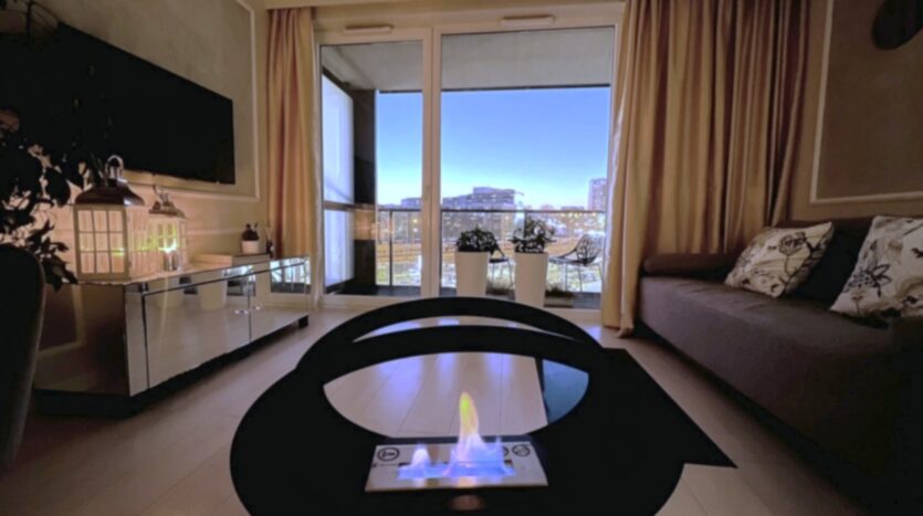 Zainstalowane w salonie oświetlenie, zaprojektowane z wykorzystaniem kryształowych lamp i ledów, wyczarowuje cudowną atmosferę. Centralnym punkt pomieszczenia jest stylowy biały stół, otoczony wygodnymi fotelami. Nad stołem góruje mozaika zaprojektowana z fazowanych luster, w której odbijają się światła kryształowych lamp. Niewątpliwym atutem salonu jest część wypoczynkowa z wygodną, rozkładaną kanapą, zapraszającą do relaksu. Przez duże panoramiczne okno roztacza się z niej rozległy widok na panoramę Moreny.