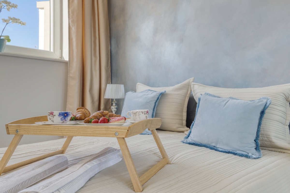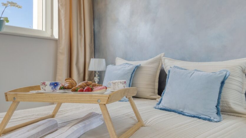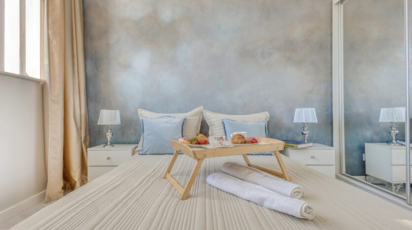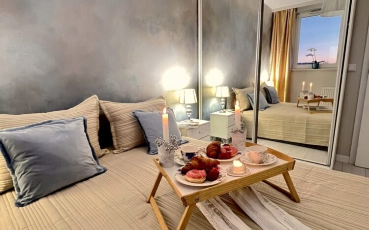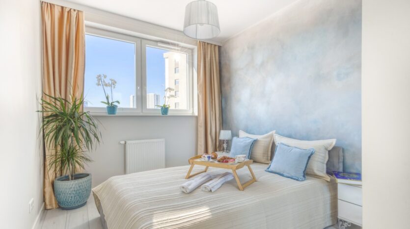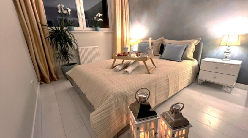 Skąpana w beżach i złocie sypialnia została wyposażona w welurowe łóżko z wygodnym oparciem oraz 2 drzwiową szafę z lustrzanymi drzwiami przesuwnymi oprawionymi w białe ramy. Niepowtarzalny urok tego miejsca zapewnia ściana z artystycznym malowidłem wykonanym w technice ombre, inspirowana burzowym niebem, przez które przebijają się złote refleksy zachodzącego słońca. Uzupełnieniem tej kompozycji są utrzymane w barwach szarości i srebra lamki nocne ustawione na białych szafkach w stylu glamour z kryształowymi gałkami.