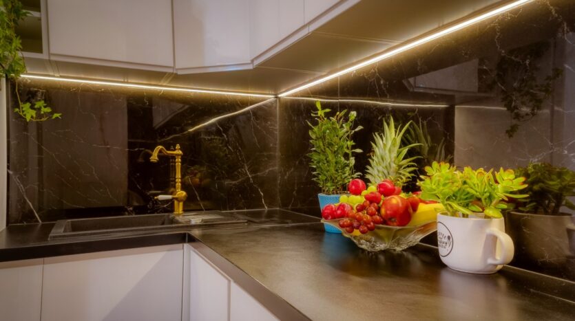 Aneks kuchenny, to połączenie bieli minimalistycznych mebli oraz czerni marmurowych kafli, tak charakterystyczne dla stylu glamour. Dopełnienie tej kompozycji stanowi konglomeratowy zlew, mosiężny kran i markowy sprzęt AGD: zmywarka, lodówka z zamrażarką, piekarnik oraz płyta indukcyjna i pochłaniacz.