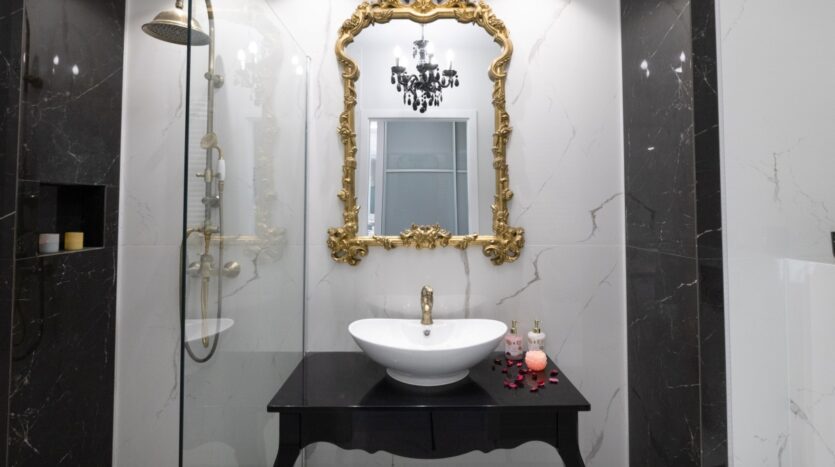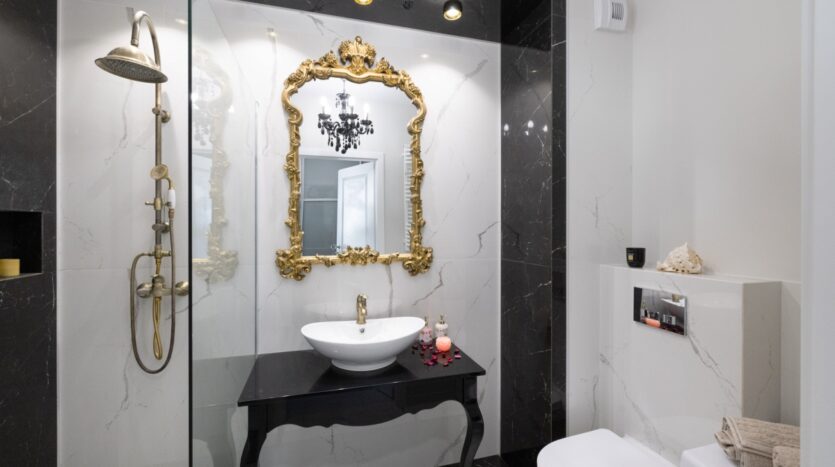 Barokowy przepych i elegancja to cechy łazienki utrzymanej w barwach bieli i czerni przełamanej różnymi odcieniami złota. Komfort i wygodę zapewnia obszerna kabina prysznicowa osłonięta hartowaną szybą. Centralnym punktem kompozycji jest designerskie lustro, oprawione w złotą bogato zdobioną ramę, dominującą nad białą ceramiczną umywalką osadzoną na czarnej, stylowej konsoli.