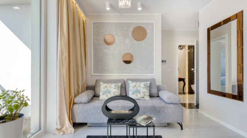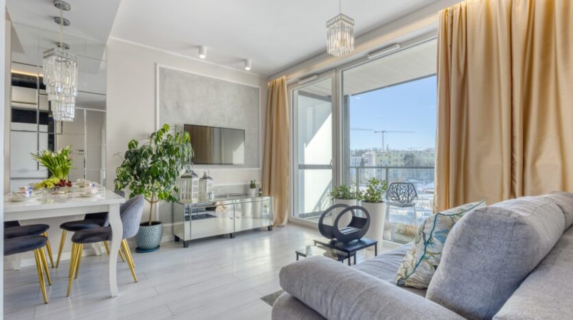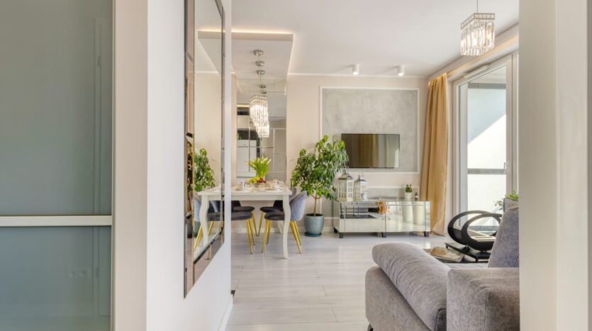Prezentowany apartament otwiera przedpokój, którego atutem jest obszerna szafa wnękowa, dyskretnie ukryta za przesuwanymi drzwiami z mlecznego szkła. Przedpokój zaprasza do eleganckiego i dobrze doświetlonego zachodnim słońcem salonu oraz przytulnej sypialni i stylowej łazienki. Od razu widać, iż we wnętrzu rządzi szlachetna, stonowana i delikatnie zróżnicowana kolorystyka, z dominującym beżem ścian, szarością betonów i tkanin, bielą mebli, co w połączeniu z kryształowymi i złotymi dodatkami inspirowanymi stylem glamour stało się znakiem rozpoznawczymi prezentowanego apartamentu.