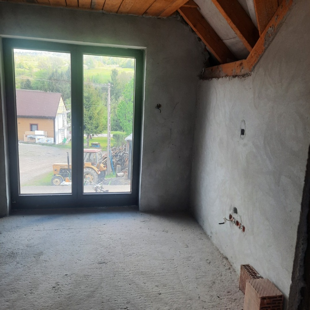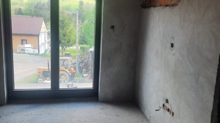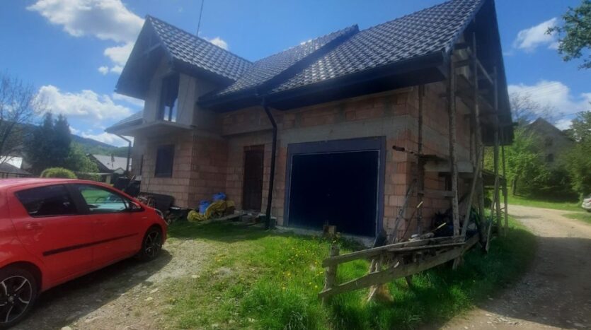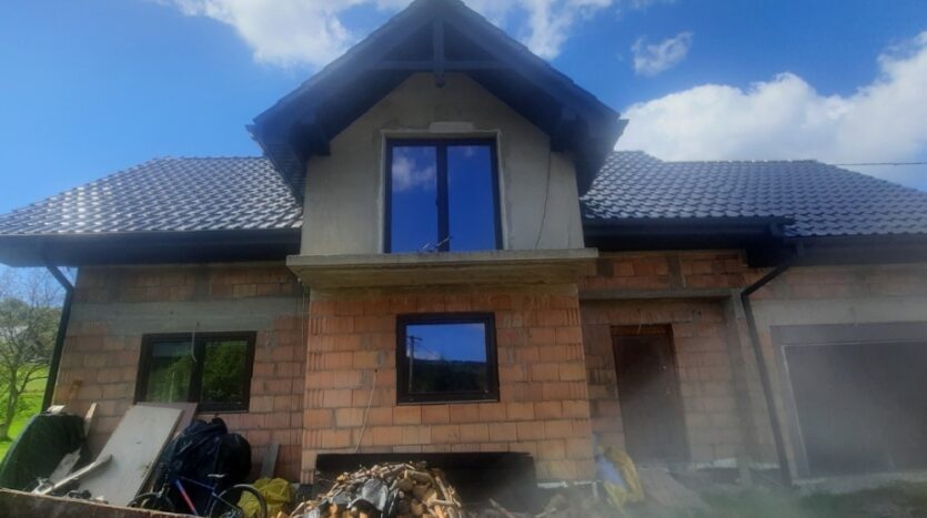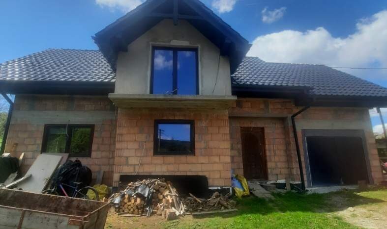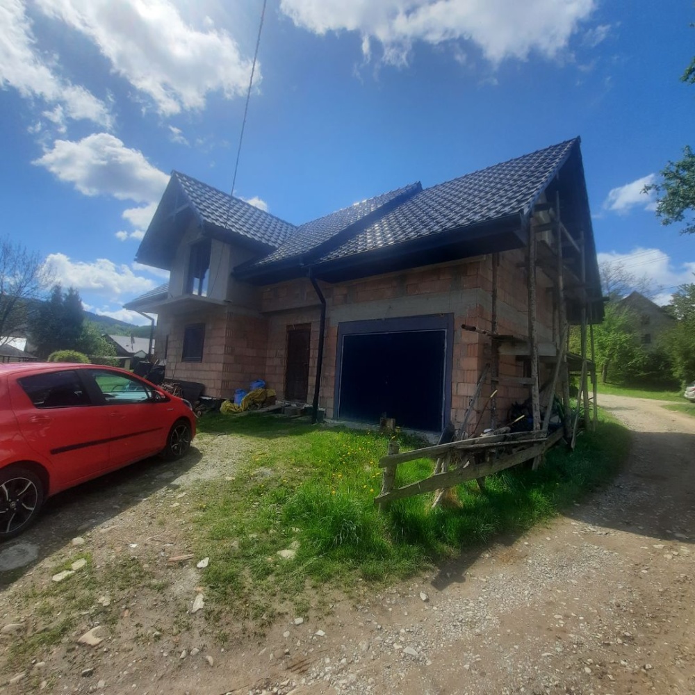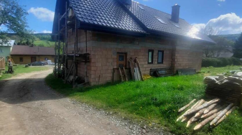 Sprzedam dom 150 m/kw na działce 7ar w Porębie koło Myślenic.Bardzo spokojna okolica,dom w drugiej linii zabudowy.Stan domu -do wykończenia.Są wylewki , tynki,stolarka.Parter-przedpokój,kuchnia,pokój dzienny,hol,łazienka,pom. gospodarcze,garaż,spiżarnia,pow.lączna 80,6 m2.Poddasze-hol,łazienka,4 pokoje,garderoba o pow łącznej użutkowej 58,7 m2.Powieszchnia całkowita 149,8 m2,Cena 495000.Mogę pomóc w uzyskaniu kredytu.