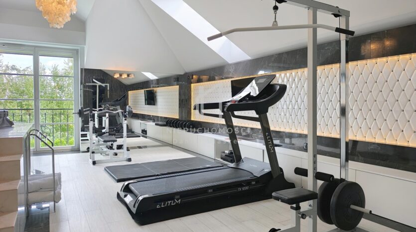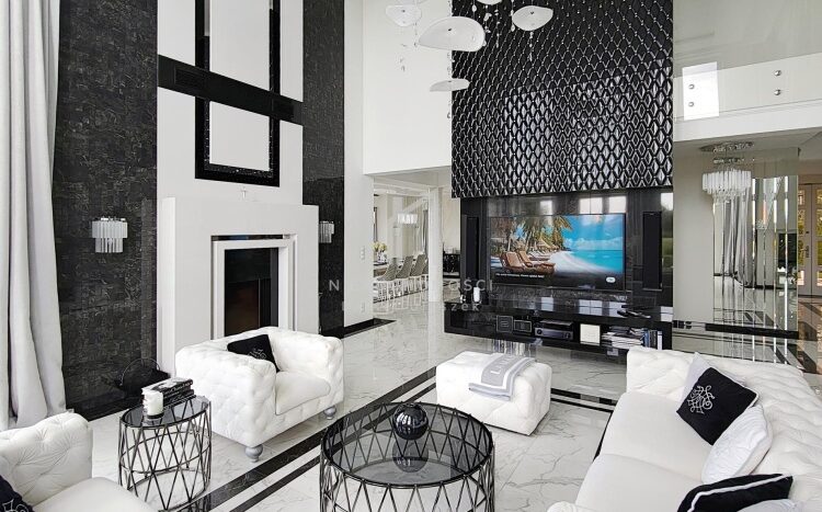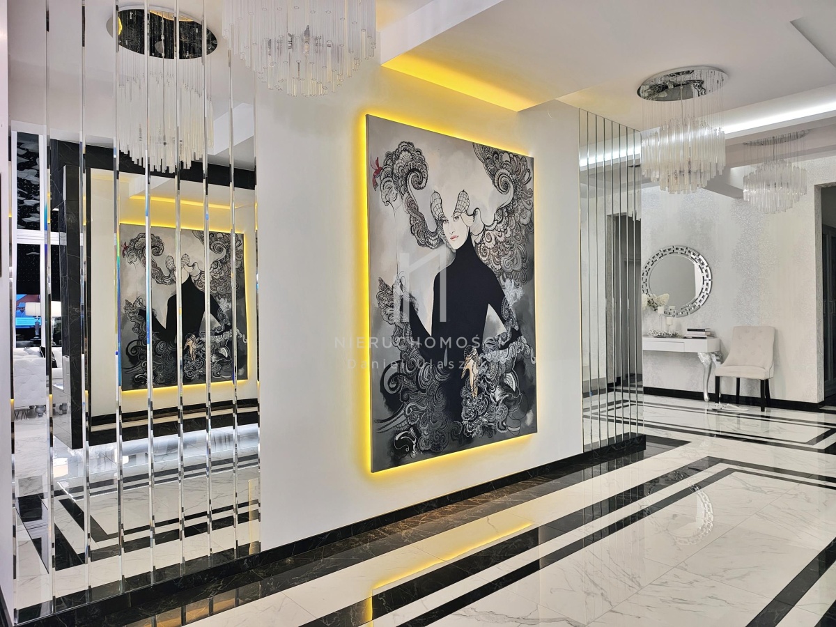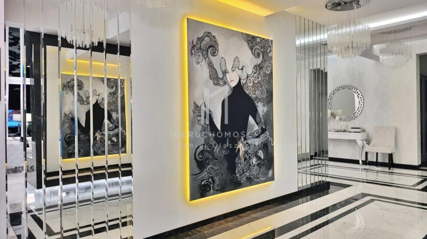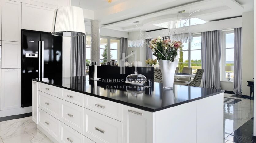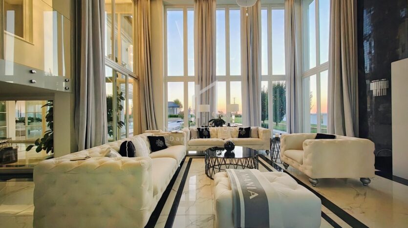 • przestronny salon z kominkiem i imponującym żyrandolem oraz wygodnym kompletem wypoczynkowym z włoskiego weluru, które w połączeniu z wysoką na 6 metry przestrzenią sufitową i panoramicznymi przeszkleniami w stylu francuskim wychodzącymi na ogród i taras – zapewnia niezwykłe doznania wizualne i przestrzenne,