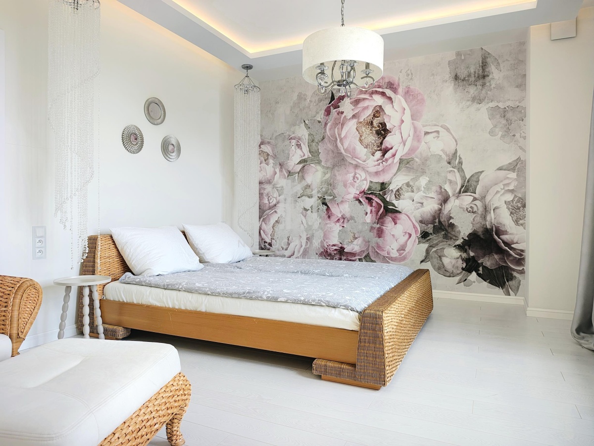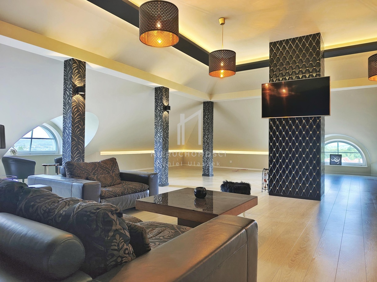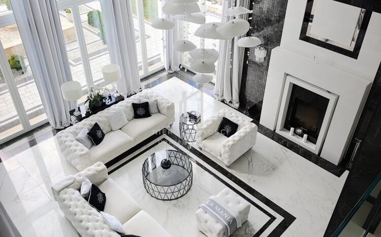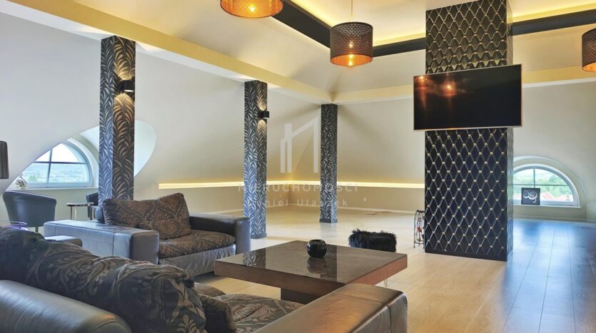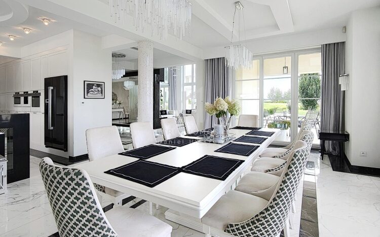 • przestronny salon z kominkiem i imponującym żyrandolem oraz wygodnym kompletem wypoczynkowym z włoskiego weluru, które w połączeniu z wysoką na 6 metry przestrzenią sufitową i panoramicznymi przeszkleniami w stylu francuskim wychodzącymi na ogród i taras – zapewnia niezwykłe doznania wizualne i przestrzenne,