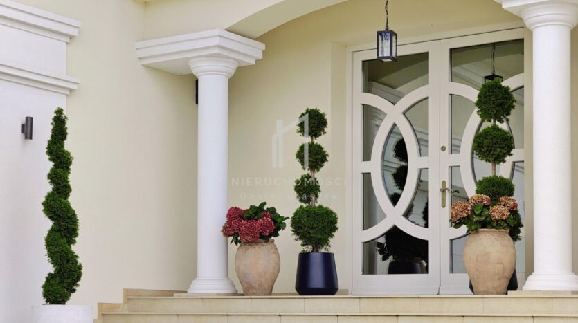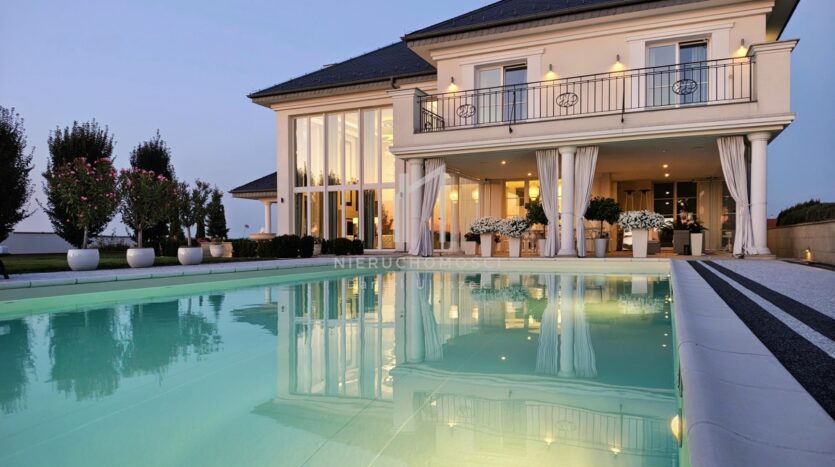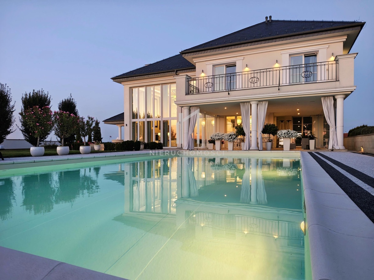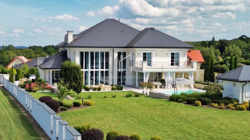 Okazała willa o powierzchni zabudowy 499 m² położona jest na działce liczącej 3382 m² (~34 arów), posesja otoczona pięknie zagospodarowanym ogrodem. Całość dopełnia reprezentacyjny, panoramiczny taras wraz z basenem o powierzchni ok. 236m² i pawilonem odpoczynkowym. Dom oferując nowoczesne rozwiązania technologiczne oraz luksusowe wykończenia z najwyższej jakości materiałów sprowadzonych głównie z Włoch i Niemiec.