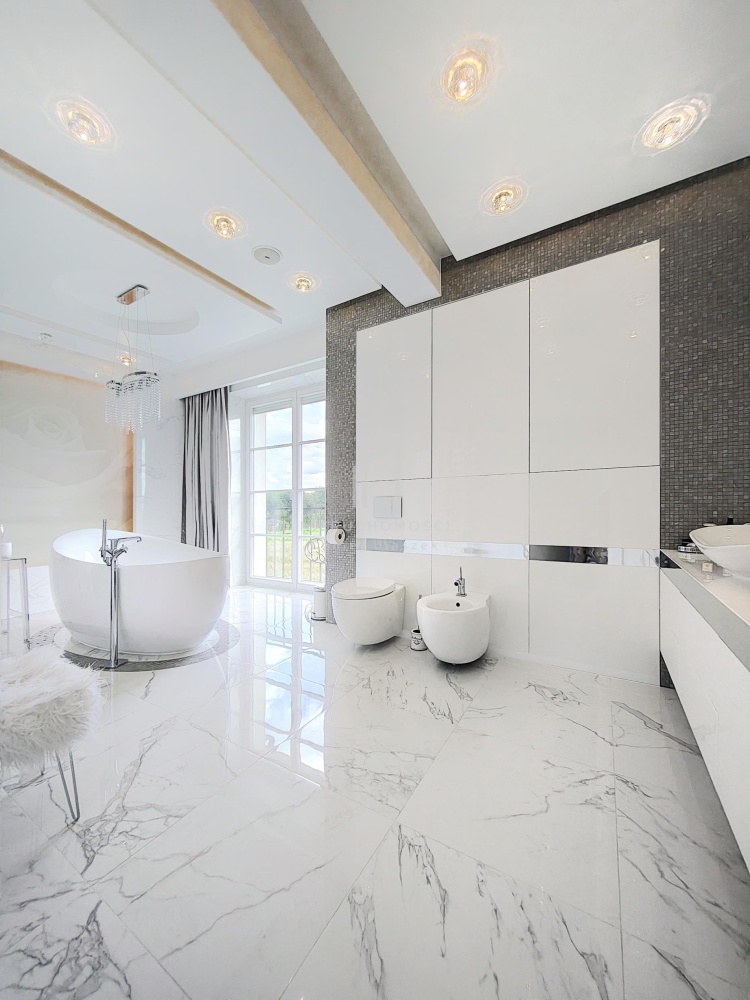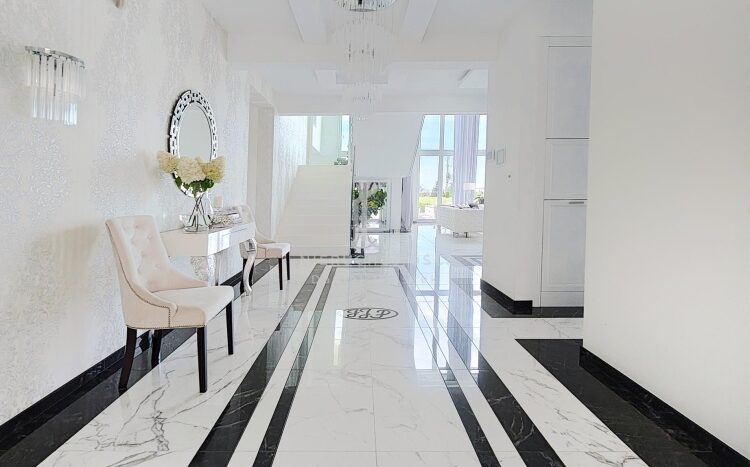 – Wysokiej jakości wykończenia takie jak: naturalny kamień piaskowy na murkach wokół basenu, biały marmur, czarny granit, spiek kwarcowy na schodach, porcelanowe płytki, przeszklenia z filtrem UV;