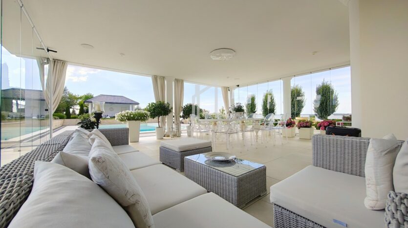 – Przestronny taras ok. 100 m2 w tylnej części willi z bezpośrednim połączeniem z basenem wraz z budynkiem stanowiącym pawilon wypoczynkowy;