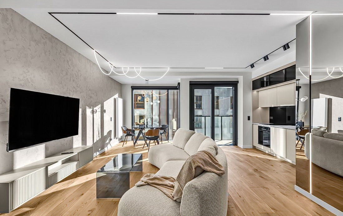 Elegancki salon z aneksem kuchennym z wyjściem na balkon, zabudową pod sufit z dymionym szkłem oraz naturalnym blatem kwarcytowym ze zintegrowanym zlewem.