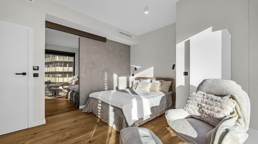 Przestronna, z podwójnym łóżkiem, toaletką i strefą relaksu. Do prywatnej garderoby prowadzą lustrzane drzwi, a dalej ściana wykończona tynkiem dekoracyjnym z efektem głębi.