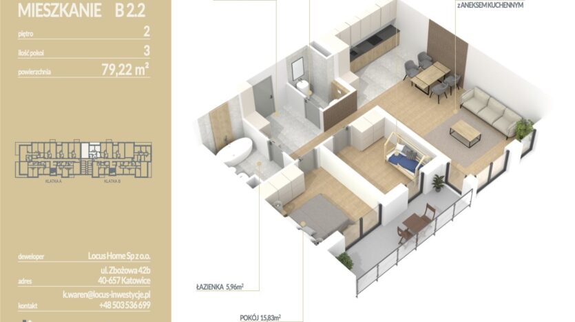 Przedstawiamy ofertę mieszkania 3 – pokojowego o powierzchni 79,00 m² z balkonem, zlokalizowanego na drugim piętrze budynku, oznaczonego nr B 2.2