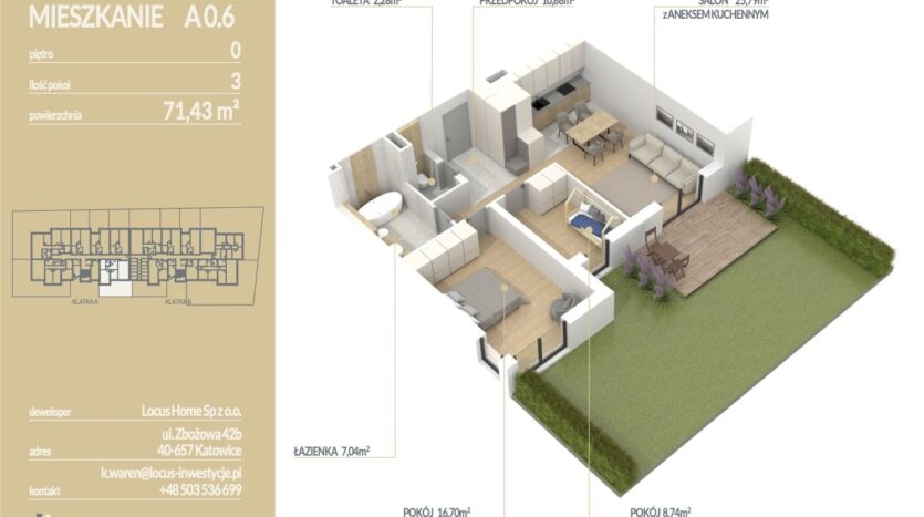 Przedstawiamy ofertę mieszkania 3 – pokojowego Z OGRZEWANIEM PODŁOGOWYM o powierzchni 71,43 m² z OGRÓDKIEM 48 m², zlokalizowanego na parterze budynku, oznaczonego nr A 0.6.