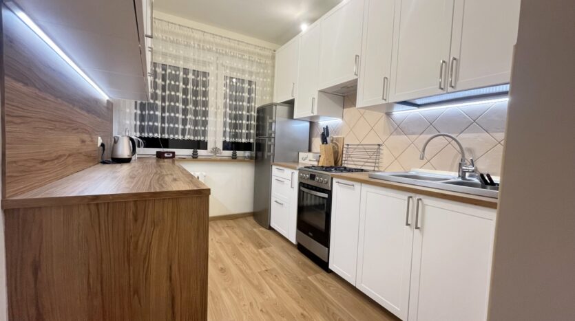 Gotowe do zamieszkania rozkładowe dwustronne mieszkanie. Ekspozycja wschód-zachód. Składa się z salonu, osobnego pokoju, oddzielnej kuchni, łazienki oraz hallu. Do mieszkania przynależy piwnica. Pod blokiem ogólnodostępny parking.