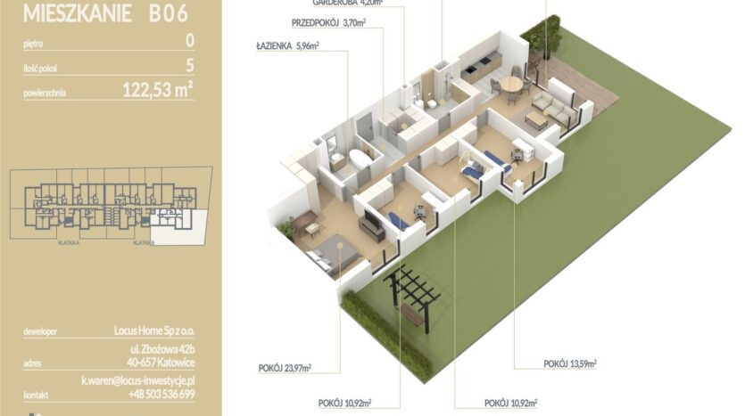 Przedstawiamy ofertę mieszkania 5 – pokojowego Z OGRZEWANIEM PODŁOGOWYM o powierzchni 122,53 m² z OGRÓDKIEM 269m², zlokalizowanego na parterze budynku, oznaczonego nr B 0.6
