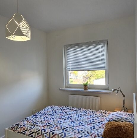 W pokoju są zainstalowane białe żaluzje. Łóżko i materac mają 140×200 cm
