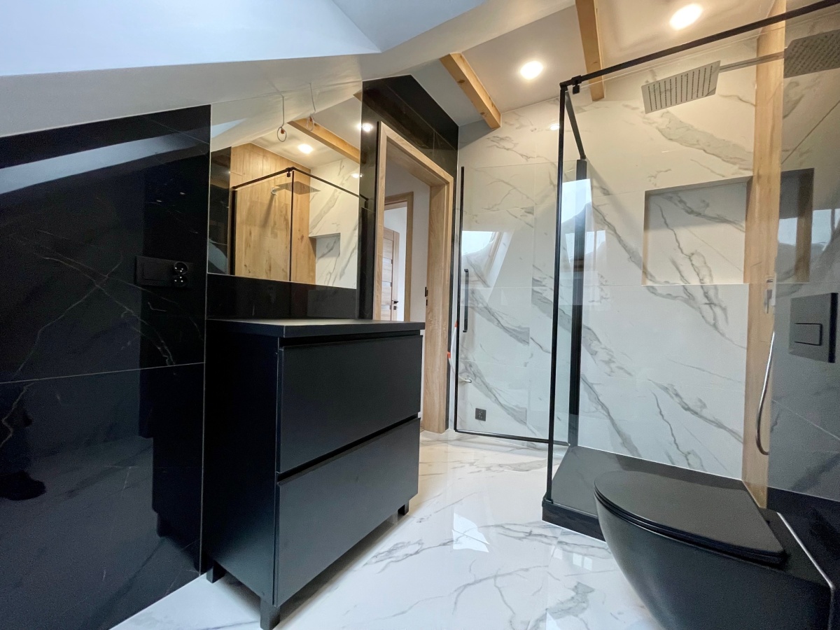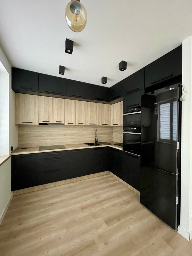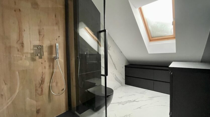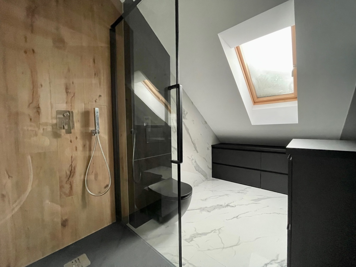 Na dole znajduje się przestronny salon z wykończonym aneksem kuchennym oraz wyjściem na balkon, w pełni wykończona łazienka oraz sypialnia. W dolnej części mieszkania zarówno w salonie jak i w łazience jest ogrzewanie podłogowe.