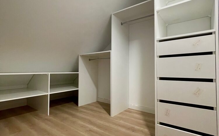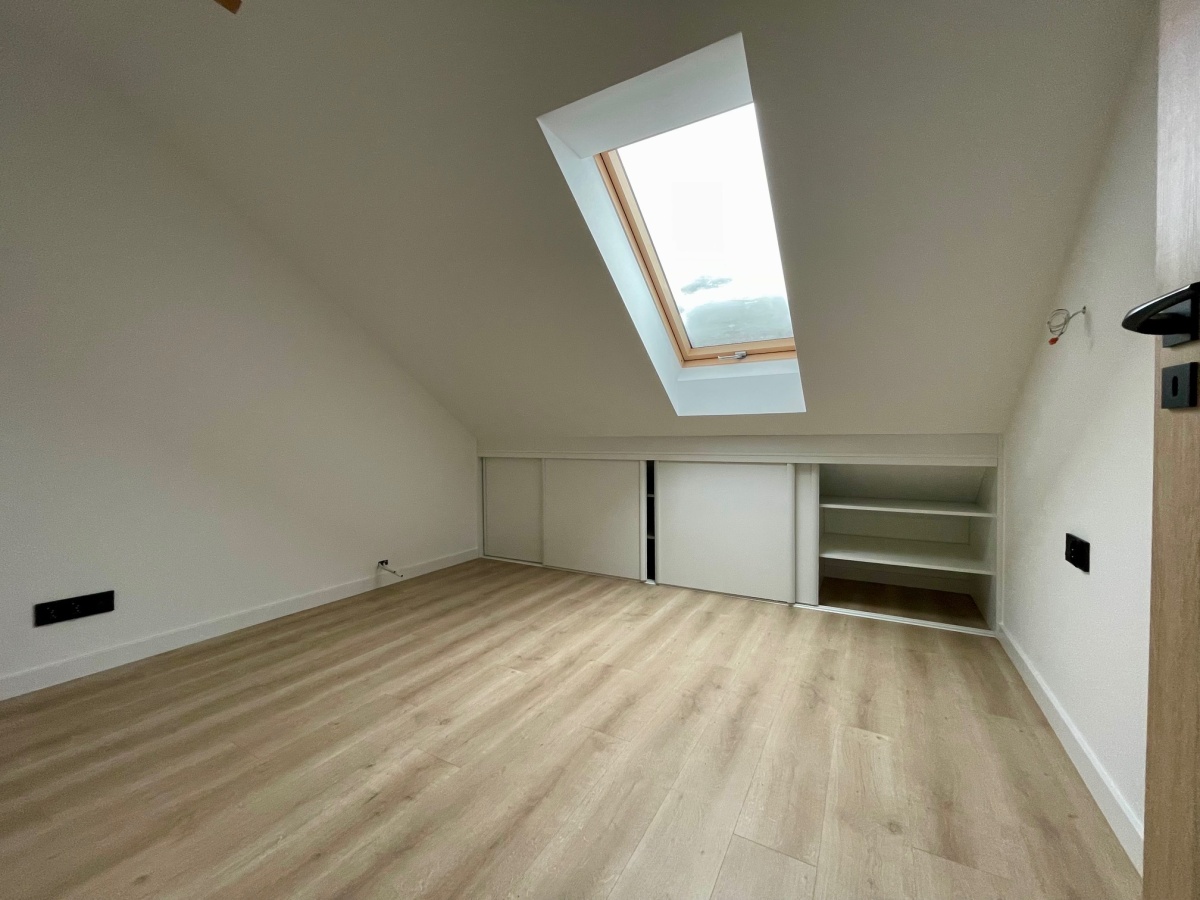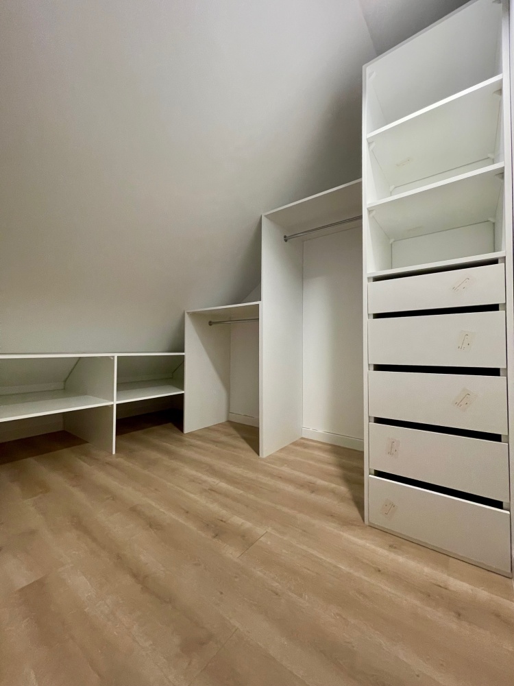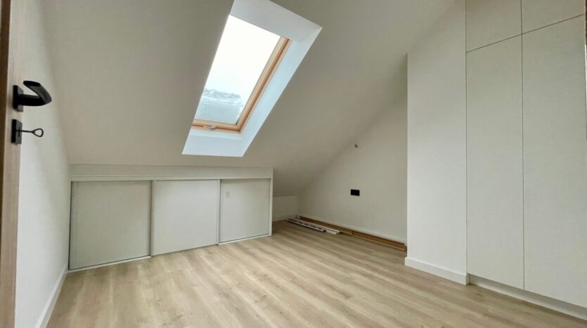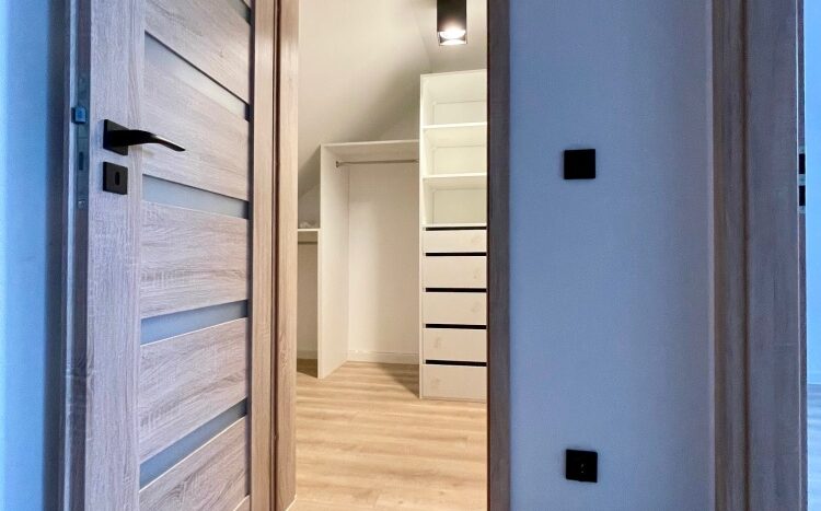 Na poddaszu mieszczą się dwa pokoje, garderoba i łazienka.