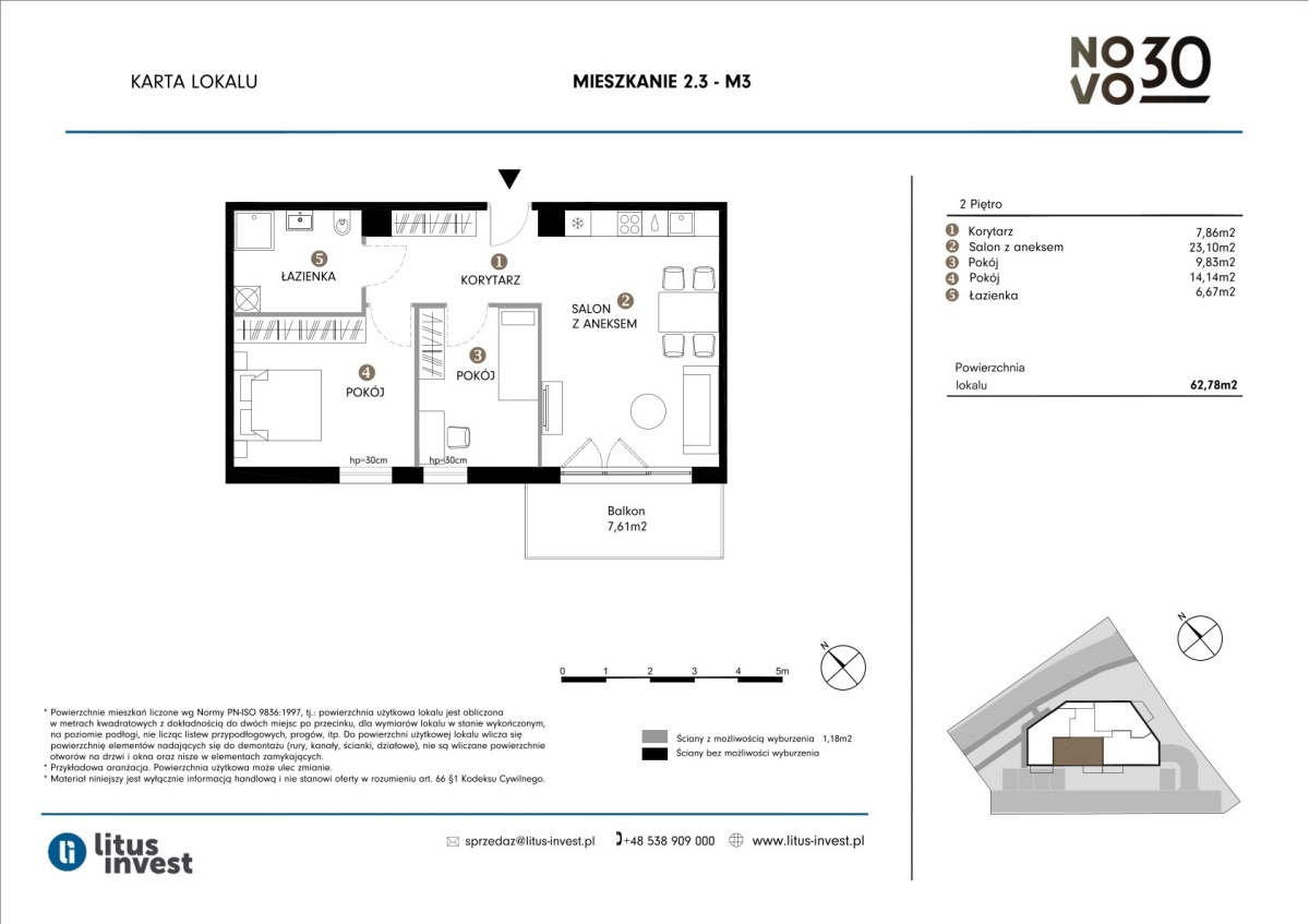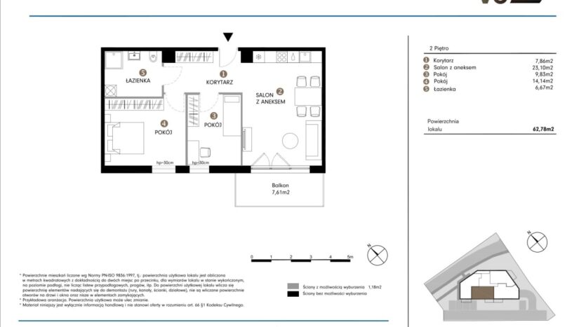 Mieszkanie jest funkcjonalnie podzielone na część dzienną i nocną. Jest jednostronne, z przestronnym balkonem o powierzchni 7,61 m².