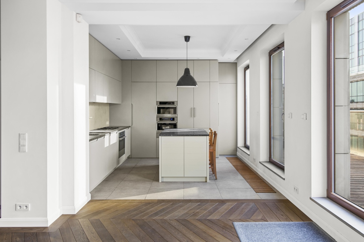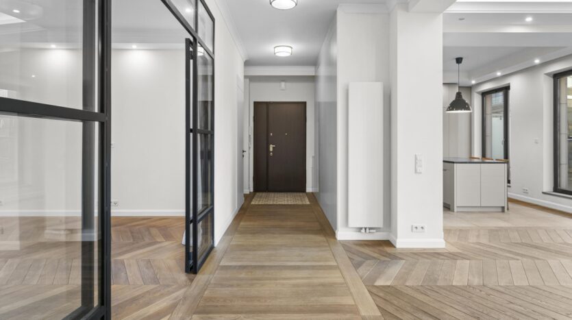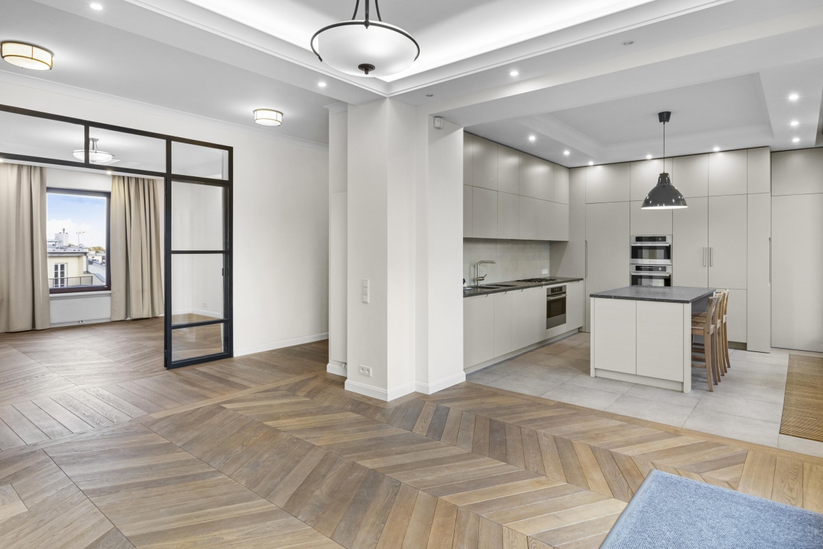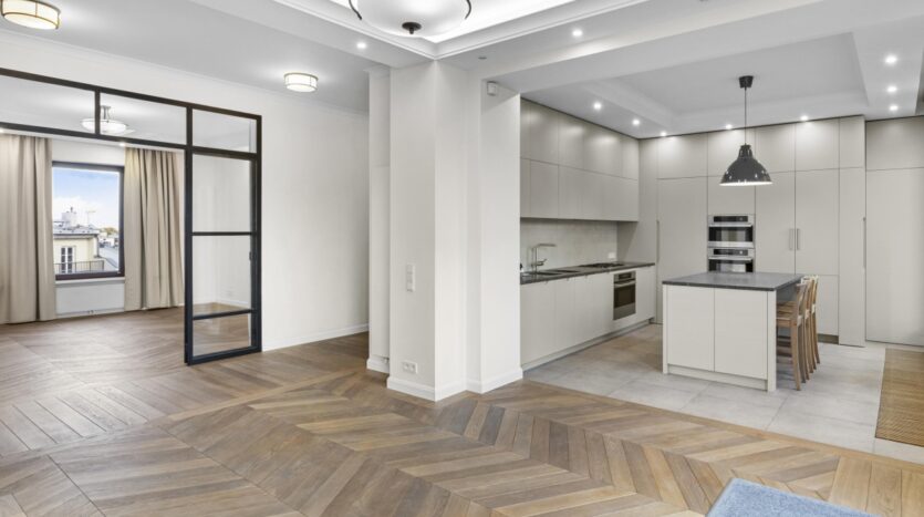 Wnętrza zostały starannie zaprojektowane, aby harmonijnie połączyć elegancję z wygodą. Oryginalne detale architektoniczne, takie jak przeszklone drzwi gabinetowe czy klasyczne parkiety, zostały pieczołowicie wkomponowane w tą fantastyczną nadbodówkę, nadając mieszkaniu wyjątkowy charakter.