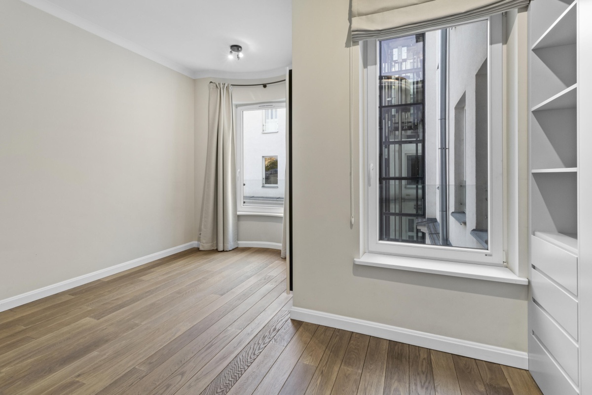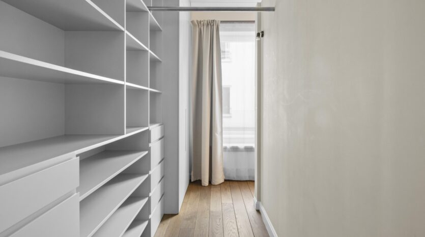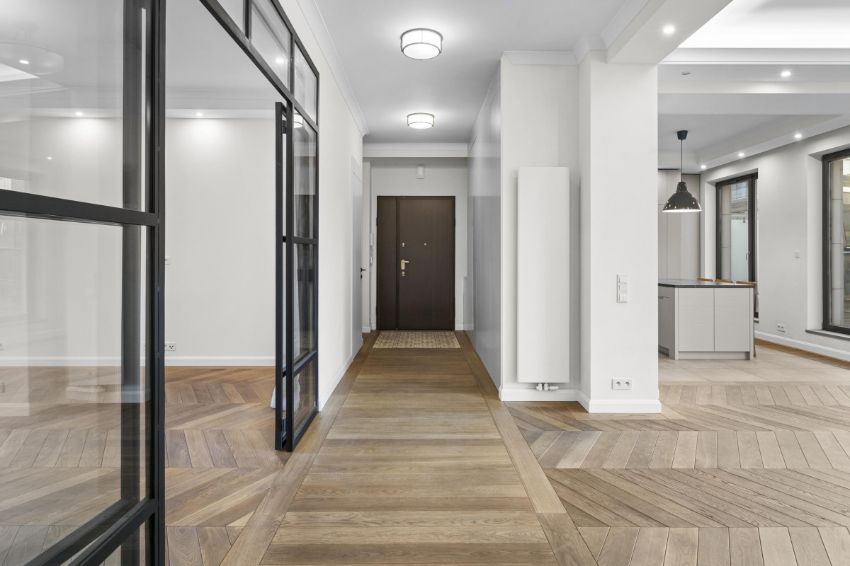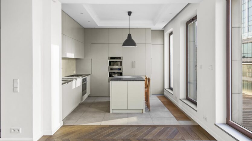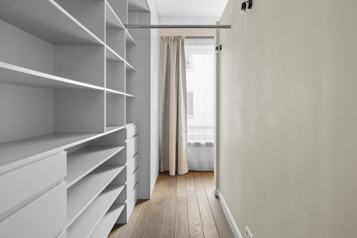 Wnętrza zostały starannie zaprojektowane, aby harmonijnie połączyć elegancję z wygodą. Oryginalne detale architektoniczne, takie jak przeszklone drzwi gabinetowe czy klasyczne parkiety, zostały pieczołowicie wkomponowane w tą fantastyczną nadbodówkę, nadając mieszkaniu wyjątkowy charakter.