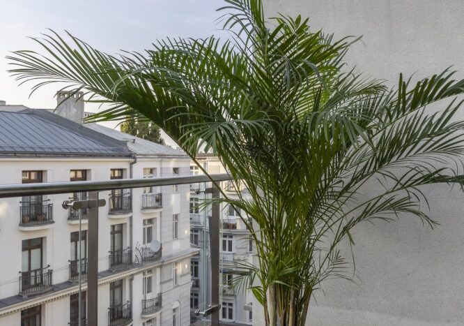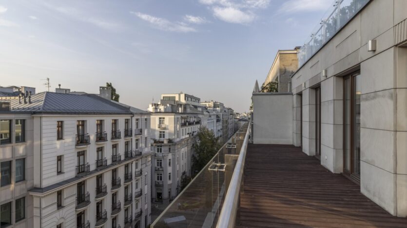 – Duży taras, z modrzewia syberyjskiego o powierzchni 30 m², z widokiem na miasto i oś ulicy Mokotowskiej, idealny na poranną francuską kawę, relaks przy zachodzie słońca na świeżym powietrzu czy wieczorne spotkania z przyjaciółmi. Taras jest wycofany od ulicy, co zapewnia ciszę, spokój i prywatność.