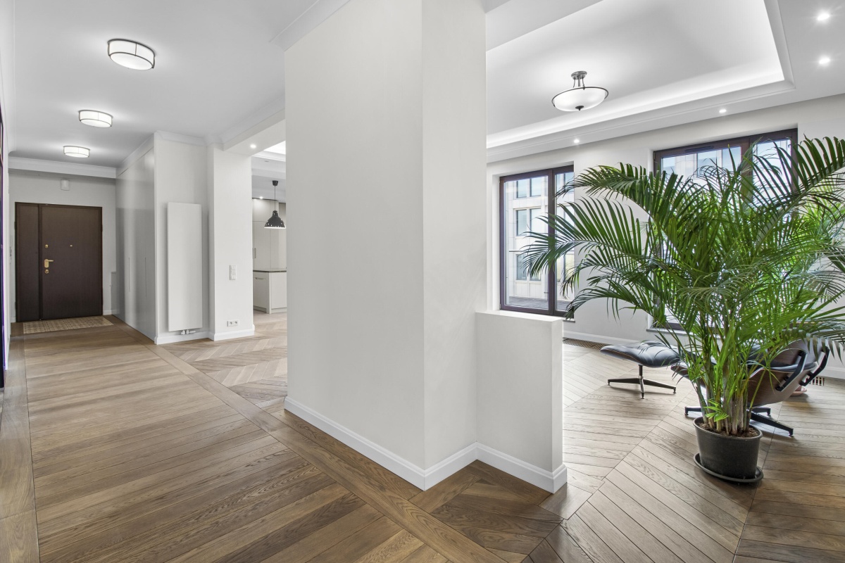 To przestronne, 182-metrowe mieszkanie mieści się na 6 piętrze odnowionej kamienicy. W jego skład wchodzą: