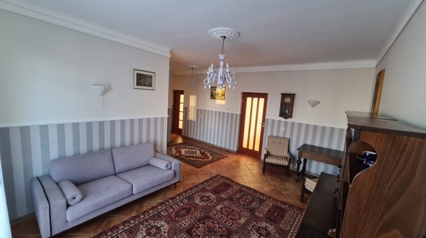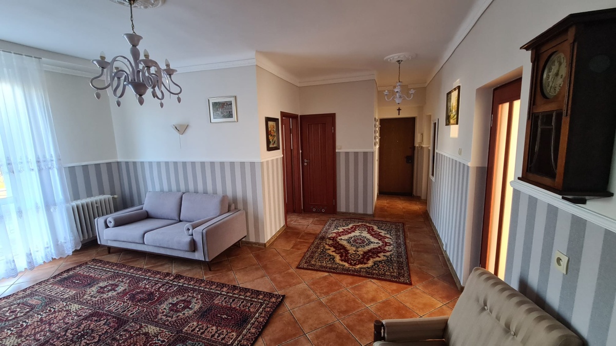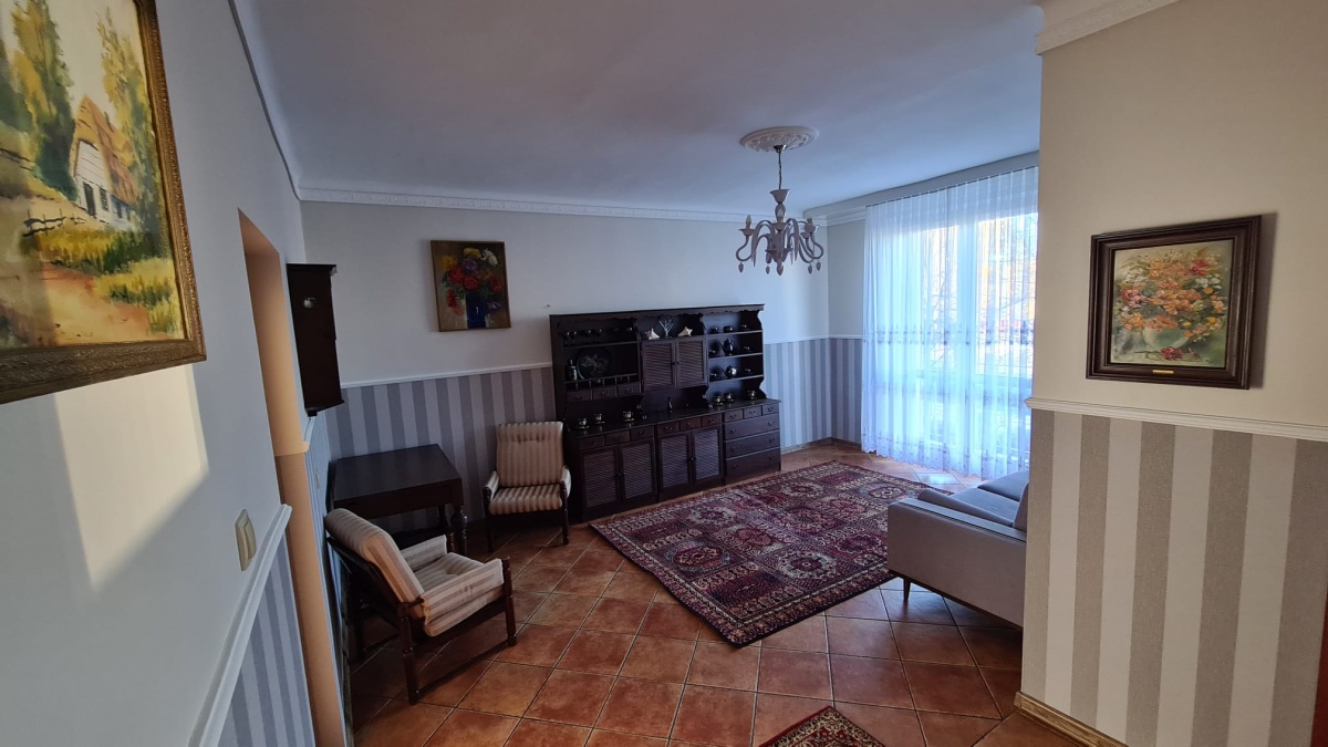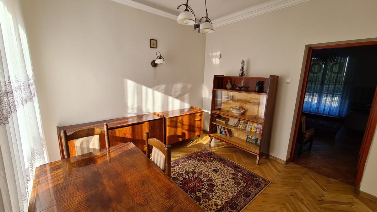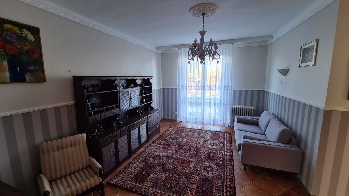 – umeblowany salon z BALKONEM, wygodną sofą, ławą, stołem i fotelami, komodą;