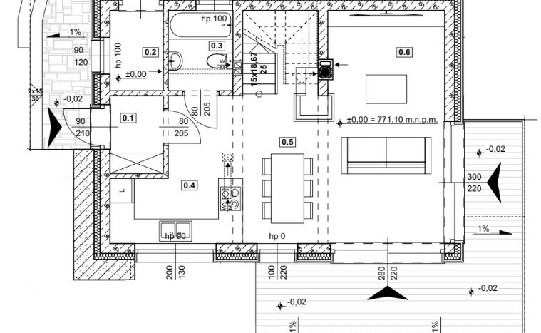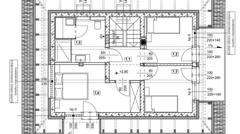 *Ściany zewnętrzne PARTERU – SCM35 o współczynniku przenikania ciepła U=0,147 W/m2K: warstwa nośna 15 cm (beton C30/37, stal A III-N), 18 cm styropianu grafitowgo, ściany kolankowe, szczytowe zintegrowane z drewnianą więźbą dachową.
