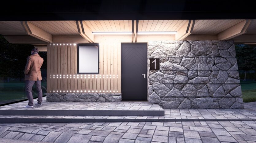*Ściany parteru: lamele drewniane, kamień naturalny