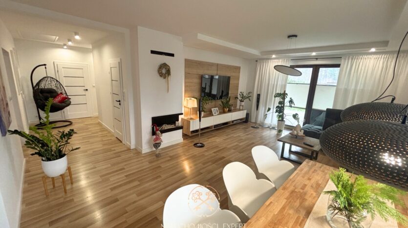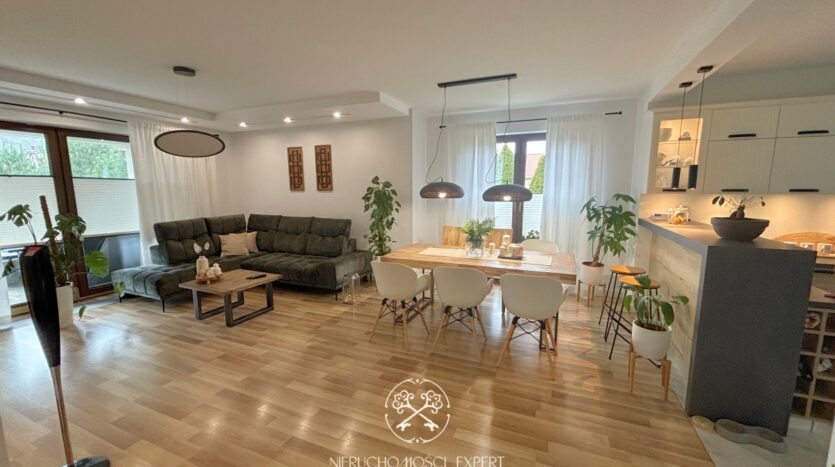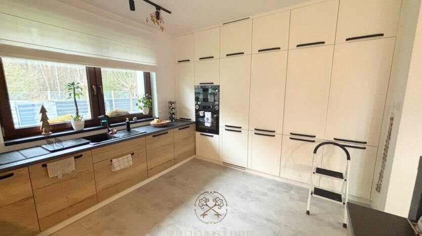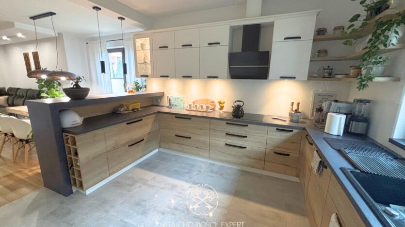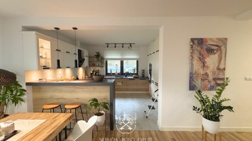 Dom został zaprojektowany i wykończony z dbałością o każdy detal. Wnętrza tworzą harmonijną, nowoczesną przestrzeń, w której funkcjonalność łączy się z estetyką. Wszystkie zabudowy meblowe wykonano na wymiar, a całość wyposażenia pozostaje w cenie nieruchomości.