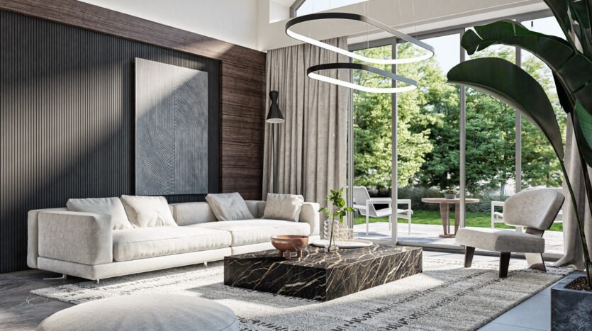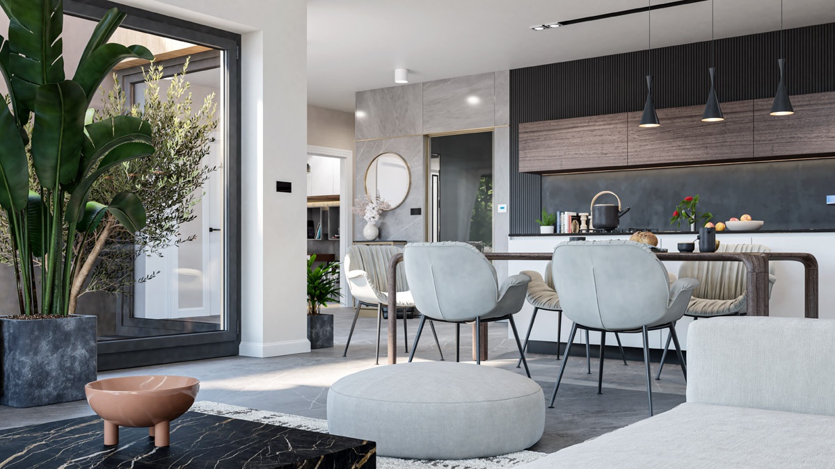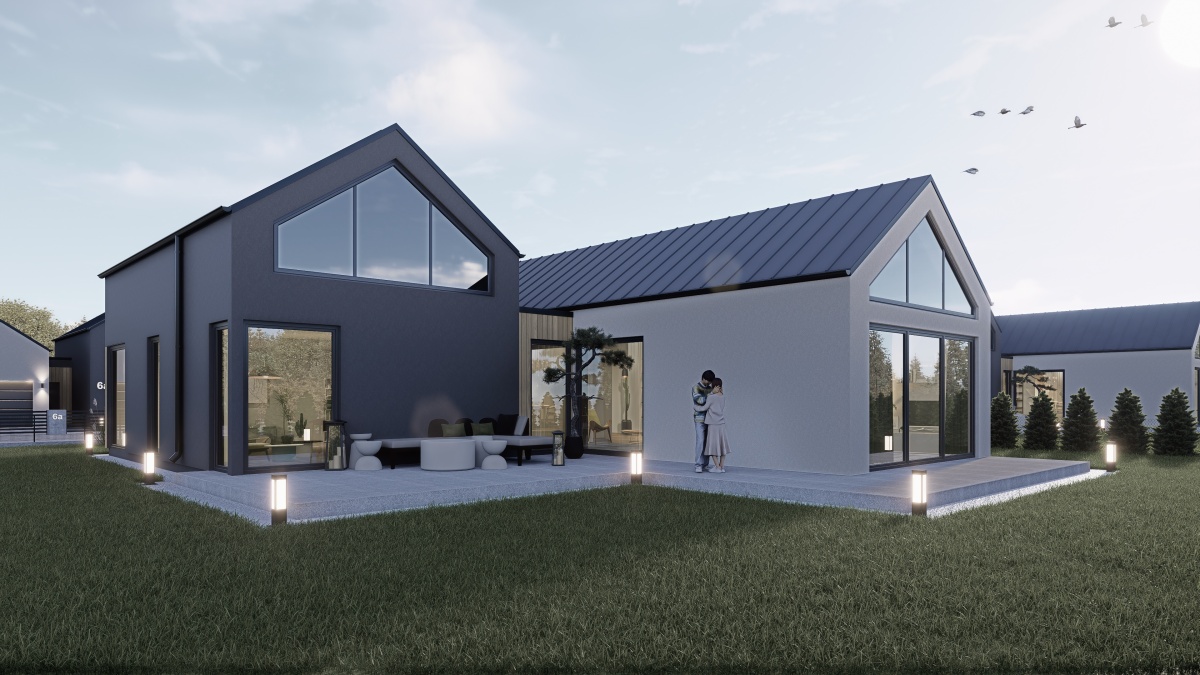Każdy dom o powierzchni 147 m² został zaprojektowany w stylu nowoczesnej stodoły. Przemyślany układ pomieszczeń oddziela strefę dzienną od prywatnej, a wysokie sufity i duże przeszklenia zapewniają przestronność i naturalne światło. Na parterze znajduje się część dzienna z kuchnią, jadalnią i salonem, trzy sypialnie oraz łazienka. Dodatkowym atutem jest użytkowe poddasze – idealne na gabinet, pokój gościnny lub przestrzeń rekreacyjną.