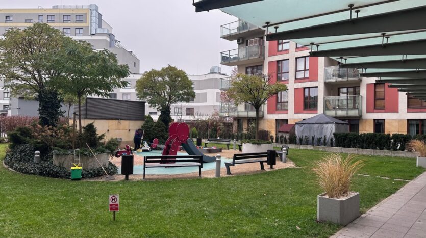 • Teren wspólny: Ogrodzone i strzeżone osiedle z wewnętrznym patio i placem zabaw.