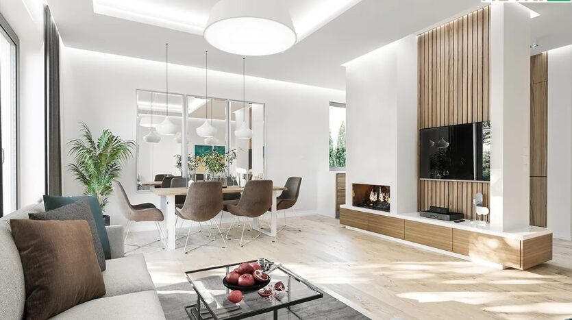 Cena budynku obejmuje wykonane ściany działowe, tynki gipsowe oraz instalacje tylko na parterze, otwory przygotowane do montażu ościeżnic i drzwi wewnętrznych.