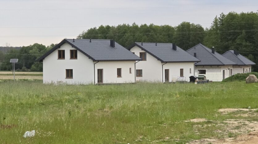 Budynki w stanie deweloperskim z wykończoną elewacją zewnętrzną , oknami, drzwiami wejściowymi, z rozprowadzonymi wewnątrz instalacjami na parterze ; elektryczną, wod-kan, instalacją CO z ogrzewaniem podłogowym na parterze i pompą ciepła.