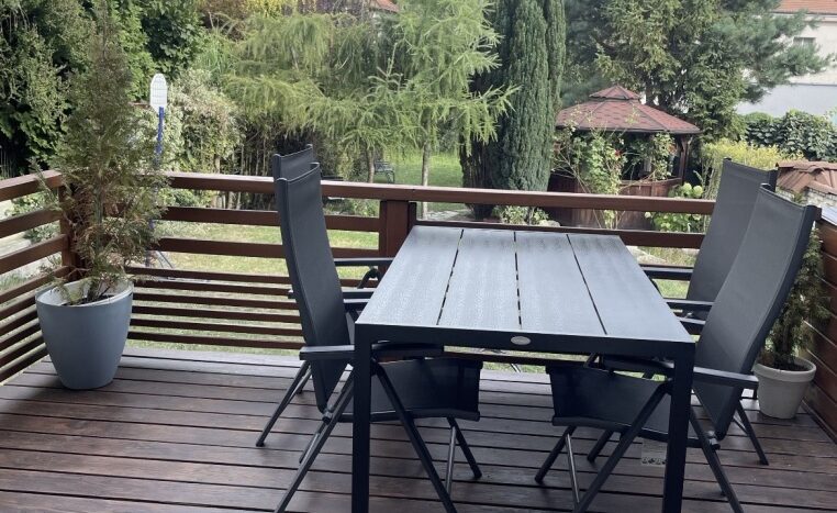 Taras drewniany z modrzewia syberyjskiego, powierzchnia, ok. 20 m², z zejściem do wspólnego ogrodu 478 m². Pod tarasem miejsce do przechowywania np drabiny, piaskownicy, kosiarki itp.