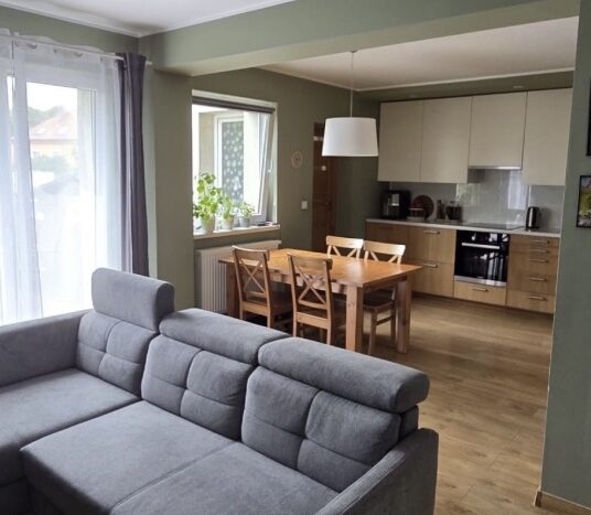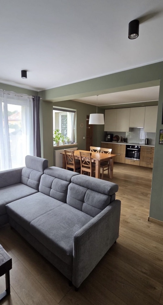 Salon z aneksem kuchennym – przestronne wnętrze o powierzchni ok. 28 m² z wyjściem na taras z ładnym widokiem.