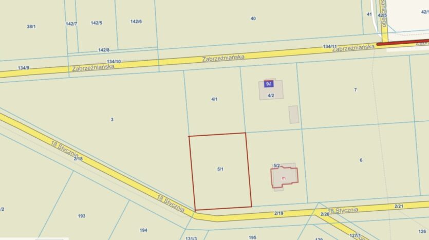 Na sprzedaż wyjątkowa działka budowlana nr 5/1, obręb 0001 o powierzchni 1281 m² i wymiarach ok. 31 m × 41 m, położona w Głownie, w dzielnicy Zabrzeźnia przy ul. 18 Stycznia.