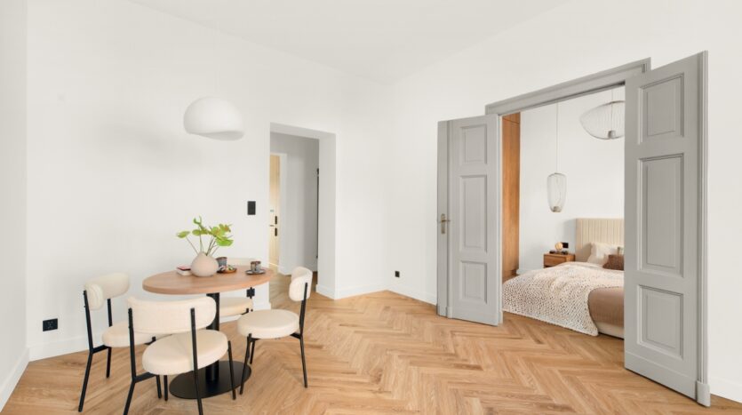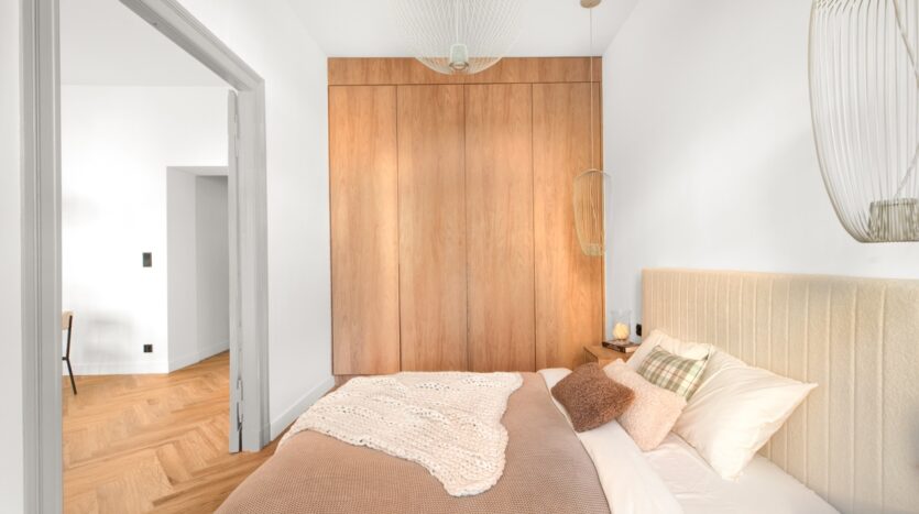 – przestronna sypialnia, do której prowadzą odrestaurowane, kamieniczne dwuskrzydłowe drzwi w kolorze szarym,