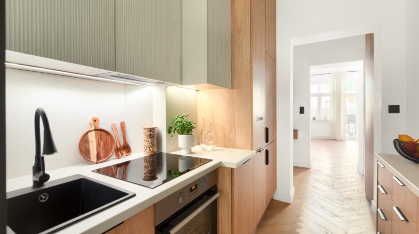 – wyposażenie : zlewozmywak, płyta indukcyjna, zmywarka, lodówka z zamrażarką, piekarnik, pochłaniacz powietrza,